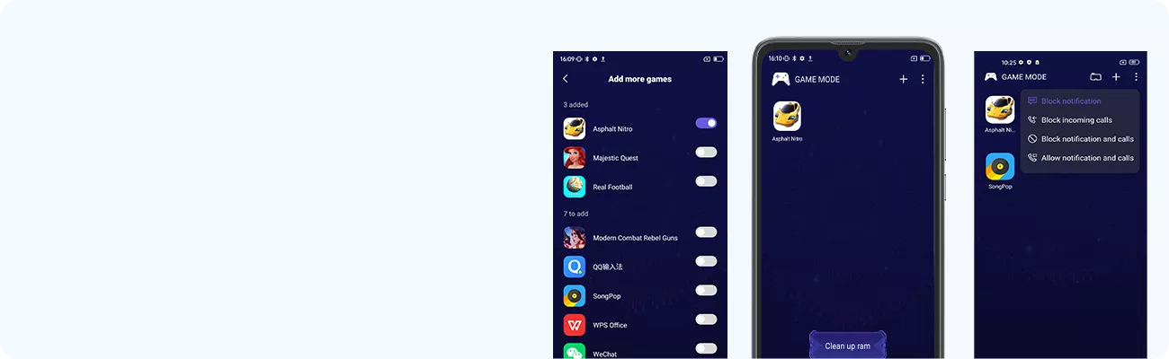 Очищает память и накопитель, блокирует уведомления во время игры.